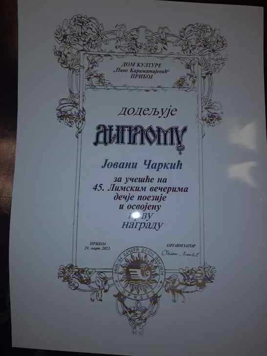 Јована Чаркић је освајала награде из књижевности, физике, хемије и одбојке. Похађа средњу музичку школу, одсек за клавир и саксофон. Добила је бројне награде на домаћим и међународним такмичењима младих песника и литерарним конкурсима у Београду, Нишу, Мокрину, Тополи, Вршцу, Савином Селу, Бечеју, Књажевцу, Драгинцу, Новом Саду и др. На 64. Међународном фестивалу дечијег стваралаштва у Бања Луци проглашена је за апсолутног победника међу 4500 учесника из 7 земаља региона и тада је добила титулу принцезе „Дјечјег царства“ 2022. г. Њене песме су до сада објављиване у Зборнику радова овог Међународног фестивала у Бања Луци, у интернет часопису „Табла“, дигиталном часопису „Чика Јова Змај“ , зборнику “Стазама доброте”, у часопису “Мој фазон”. Била је учесник „Стваралачког кампа“ Љубивоја Ршумовића на Златибору 2022. године. Победила је на Лимским вечерима поезије у Прибоју 2023. године. Као полазник Регионалног центра за таленте у Чачку написала је свој први истраживачки рад “Од загонетке до загонетне приче Уроша Петровића” са којим је освојила 3. републичку награду и 1. специјалну награду за најбољи рад из књижевности у Републици Србији школске 2022/2023. године.